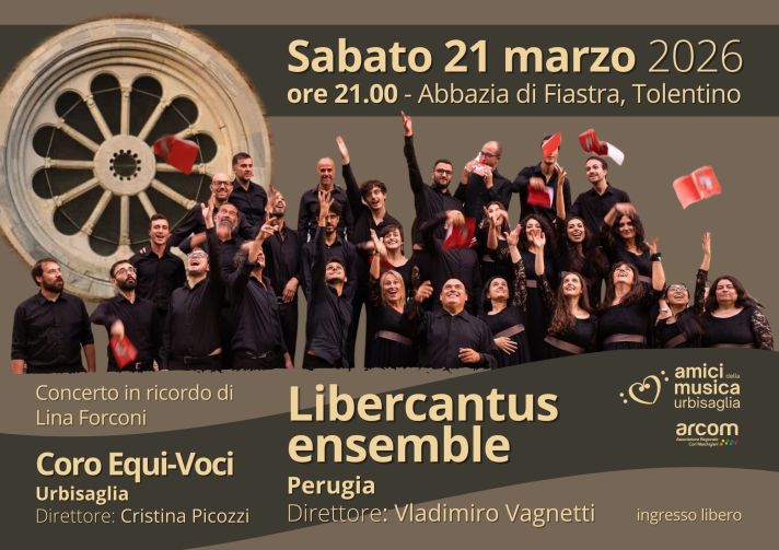 Sabato 21 marzo 2026 – ore 21.15LIBERCANTUS ENSEMBLEdirettore: Vladimiro VagnettiAbbazia di Chiaravalle di Fiastra (Tolentino)ingresso gratuito Archivio concerti Archivio concerti del Coro Equi-Voci Archivio concerti Musica da Bosco Condividi: Condividi su X (Si apre in una nuova finestra) X Condividi su Facebook (Si apre in una nuova finestra) Facebook Condividi su WhatsApp (Si apre in una nuova finestra) WhatsApp Condividi su Telegram (Si apre in una nuova finestra) Telegram Condividi su LinkedIn (Si apre in una nuova finestra) LinkedIn Condividi su Threads (Si apre in una nuova finestra) Threads